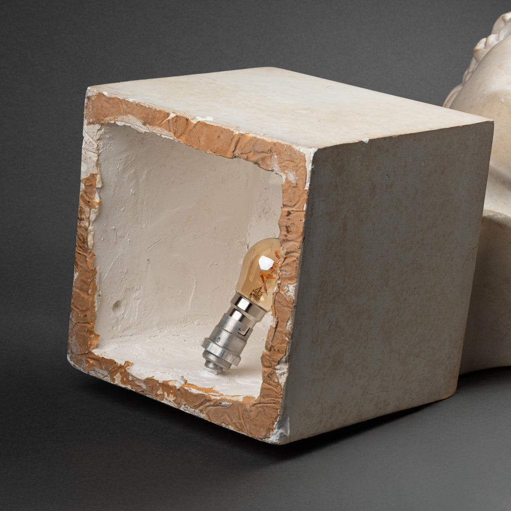 Patinated plaster cast mounted as a lamp.