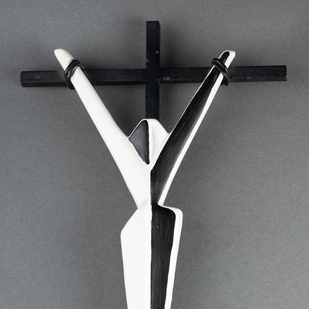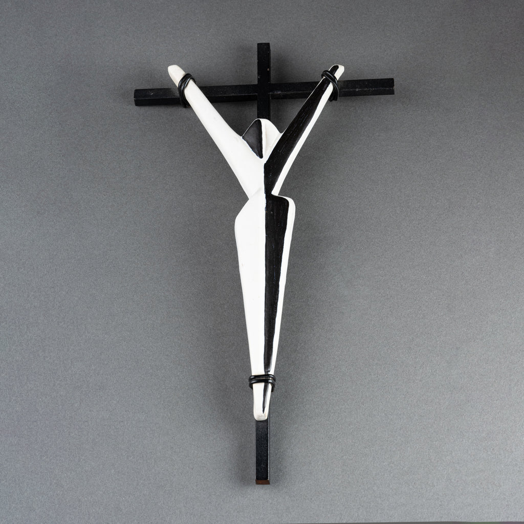Céramique émaillée blanc et noir. Croix en métal laqué noir (dans l'esprit de Roger Capron).